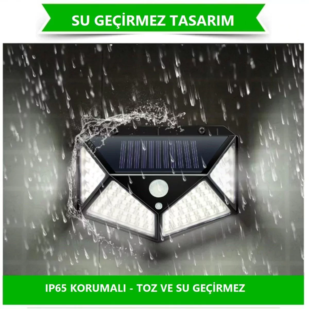 GENİŞ KULLANIM ALANI: 3 FARKLI MODLU KOLAY KURULUM DOĞA DOSTU & GÜNEŞ ENERJİLİ GENİŞ AÇILI TASARIM SU GEÇİRMEZ IP65 KORUMALI ÖZELLİKLER: Giri ş voltajı: 5.5 V Toplam güç: 20 W Ampul tipi: LED Işık Kaynağı: Güneş Işığı LED Miktar: 100 Adet LED Işık Rengi: Beyaz Güç kaynağı: 1 Adet 3.7 V 2200 mAH lityum pil Şarj Süresi: 8 Saat Çalışma Saati: Yaklaşık 8 Saat Sensör Açısı: 120 ° Sensör Mesafesi: 3-5 m Koruma Sınıfı: IP65 Malzeme: ABS Ürün Rengi: siyah Ürün Boyutu: 125x88x47mm ÇALIŞMA MODLARI: Ürün üzerinde bulunan tuşa bastıktan sonra ; 1 - Hareket sensörü herhangi bir hareket algıladığında çalışır. Eğer herhangi bir hareket algılamazsa kapalı konumda olur. 2- Ürün %25 kapasite ile ışık verir. Hareket sensörü hareket algıladığında 20 saniye boyunca tam kapasite aydınlatır, ardından tekrar %25 kapasiteye döner. 3- Enerji koruma moduna geçer ve sürekli düşük ışık verir. PAKET İÇERİĞİ: 1 Adet 100 LED Solar Lamba Kullanma Kılavuzu (İngilizce) Dübel ve Vida