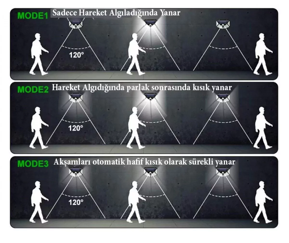 2- Ürün %25 kapasite ile ışık verir. Hareket sensörü hareket algıladığında 20 saniye boyunca tam kapasite aydınlatır, ardından tekrar %25 kapasiteye döner.
