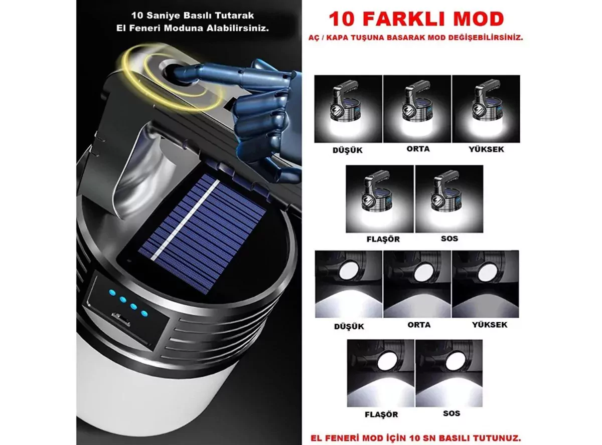 Eşsiz bir tasarım sayesinde çok amaçlı ultra güçlü güneş enerjili (solar panel) sayesinde kolay şarj imkanı ! Portatif bir el feneri olarak veya masa lambası olarak kullanılabilir. Bir ağaca veya diğer uygun noktaya asılabilen bir kamp feneri olarak kullanılabilir. Su geçirmez ıpx65 özelliği: