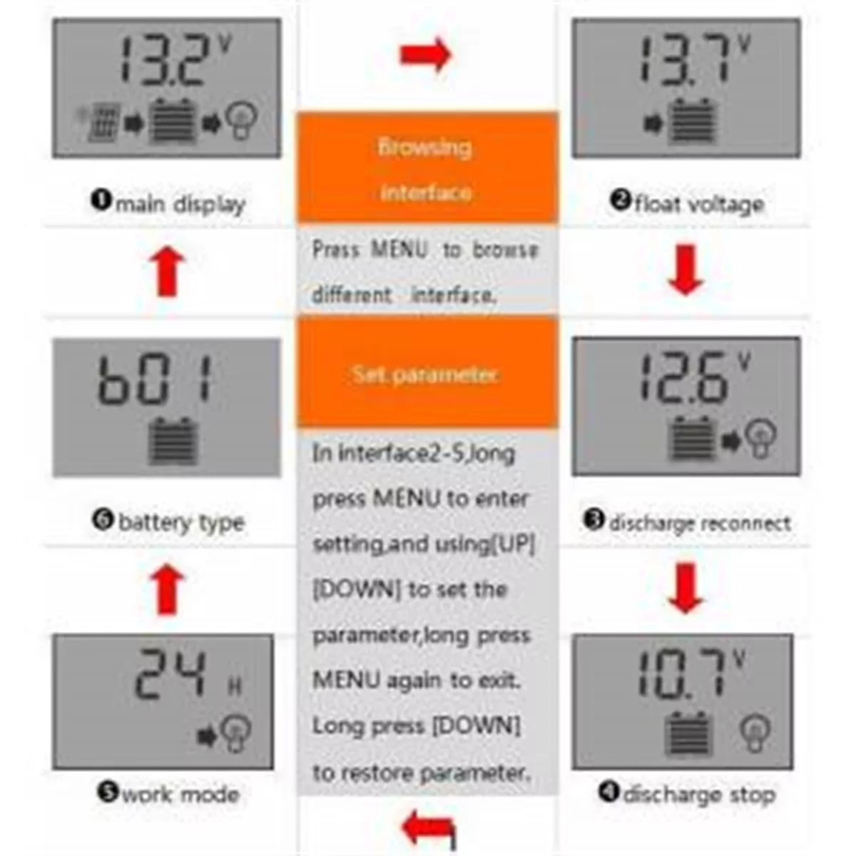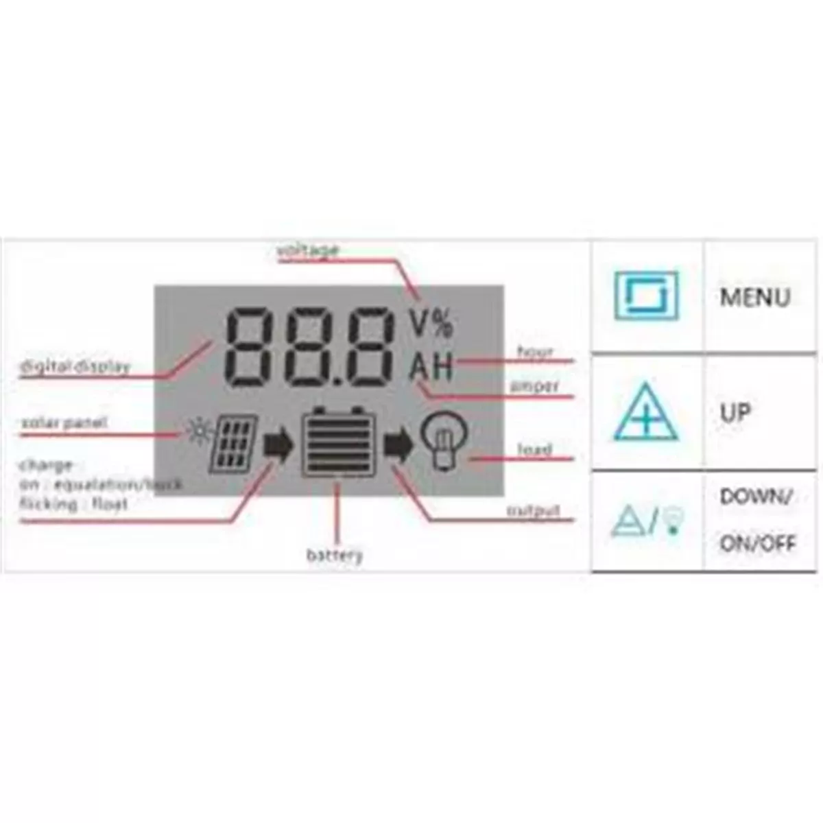 2 USB Şarj portu: 5V 3A Çalışma Sıcaklığı : -35 ° C ile + 60 ° C Kendiliğinden Kendi Tüketimi : 10mA Şamandıra Şarjı: 13V (varsayılan veya ayarlanabilir) Deşarj durması: 10.7V (varsayılan veya ayarlanabilir) Deşarj tekrar 12.6 V (varsayılan veya ayarlanabilir) Boyut: 133x70x32mm LCD ekran