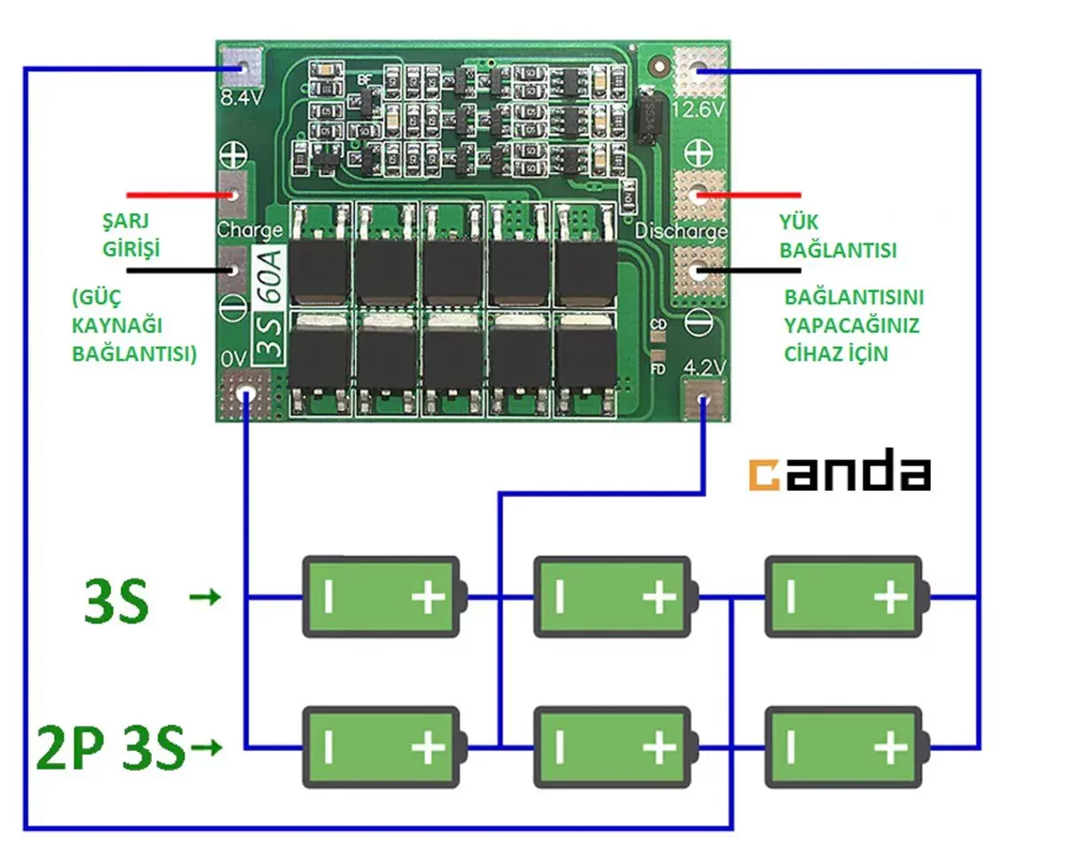 Not 2: 0 V, 4.2 V, 8.4 V, 12.6 V kablolama yaparken, lütfen kablolama şemasına göre kesinlikle yapın. Kısa devre yapmaktan kaçının.