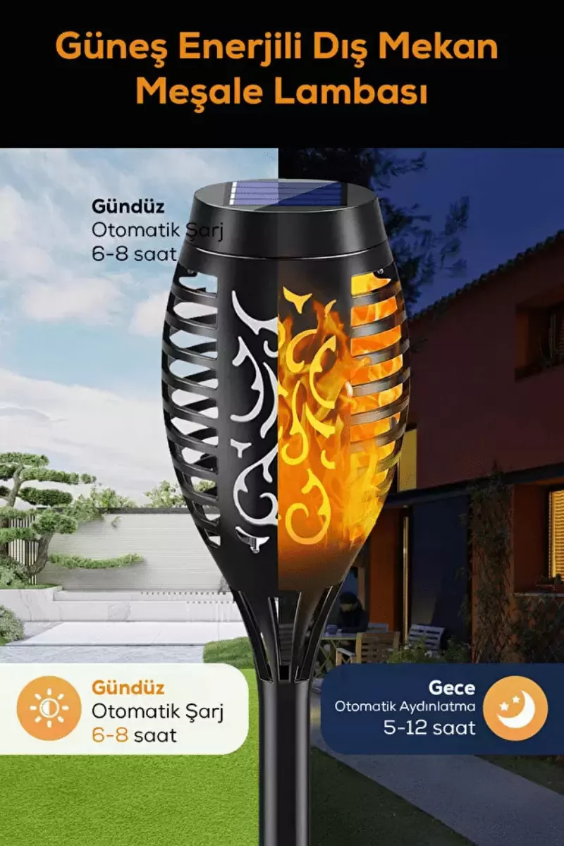 Lamba, alev efektli meşale şeklinde tasarlanmıştır. Bu, bahçenizde hareketli ve sıcak bir atmosfer yaratır. - Solar Enerjili ve Otomatik: