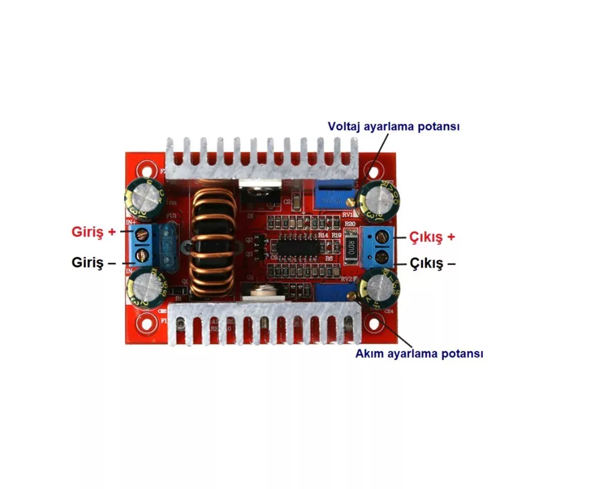 Giriş: 8.5-50V –> Çıkış: 10-60V Modül adı: 400W Voltaj Yükseltici Modül özellikleri: İzole olmayan step-up modülü (BOOST) Giriş voltajı: DC8.5V-50V Giriş akımı: 15A (MAX) 8 amperi aşıyorsa soğuyucuyu kuvvetlendiriniz Sessiz akım: 10mA (12 V litre 20 V, çıkış voltajı, akım çok sessiz artacak) Çıkış voltajı: 10-60 V (ayarlanabilir) Sabit aralık: 0.2-12A (Akım sabitlenebilir) Sıcaklık: -40 ila + 85 derece (sıcaklığın yüksek olduğu durumda soğutucuyu kuvvetlendiriniz) Çalışma frekansı: 150 KHz Dönüşüm verimliliği: 96% 'e kadar Aşırı akım koruması: Var Giriş ters polarite koruması: Yok Kurulum: 4 2.55mm vida delikleri Bağlantı yöntemi: Bağlantı çıkışı Modül boyutu: 67mm X 48mm X 28mm Kullanımı: 1. DIY(Kendin yap) bir güç kaynağı, 12 V giriş ve çıkış 12-50 V ayarlanabilir olabilir. 2. Elektronik cihazınız için güç kaynağı, sisteminize göre çıkış voltajı değerini ayarlayabilirsiniz. 3. Dizüstü bilgisayarınız için araba güç kaynağı olarak, PDA veya çeşitli dijital ürünler kaynağı. 4. DIY bir mobil dizüstü güç kaynağı: 12 V yüksek kapasiteli lityum pil paketi ile birleştiğinde, böylece laptop ile rahatça yer değiştirebilirsiniz. 5. Güneş paneli için voltaj regülatörü olarak kullanabilirsiniz. 6. Akü, şarj edilebilir lityum piller ile kullanılabilir. 7. Yüksek güçlü LED sürücüsü Örnek Kullanım Videosu: Paket içeriği: x1 400W Voltaj Yükseltici