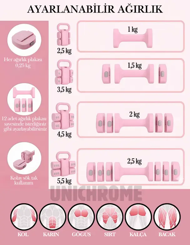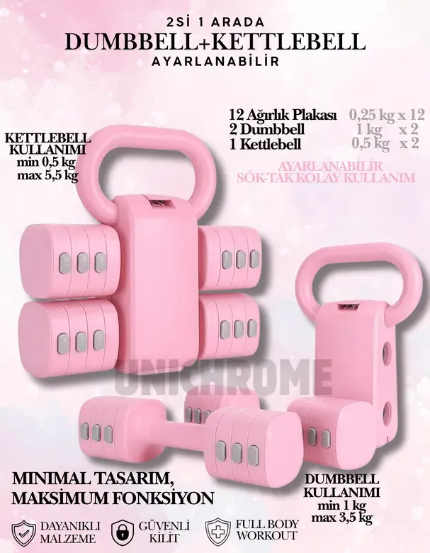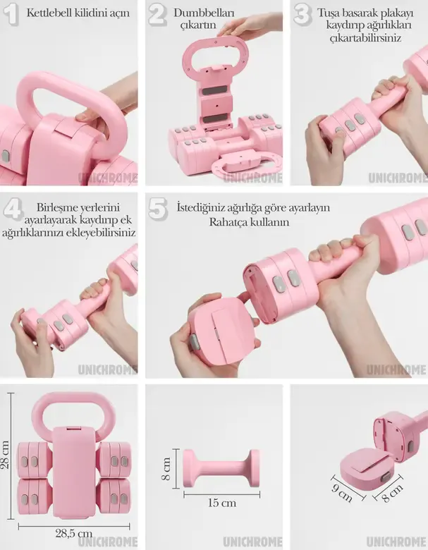 Evde spor yapmayı kolay ve eğlenceli hale getiren bu çok amaçlı ürün, hem dambıl hem de kettlebell olarak kullanılabilir. Tek bir setle farklı antrenmanlar yaparak kaslarını çalıştırabilir, güç ve dayanıklılığını artırabilirsin.