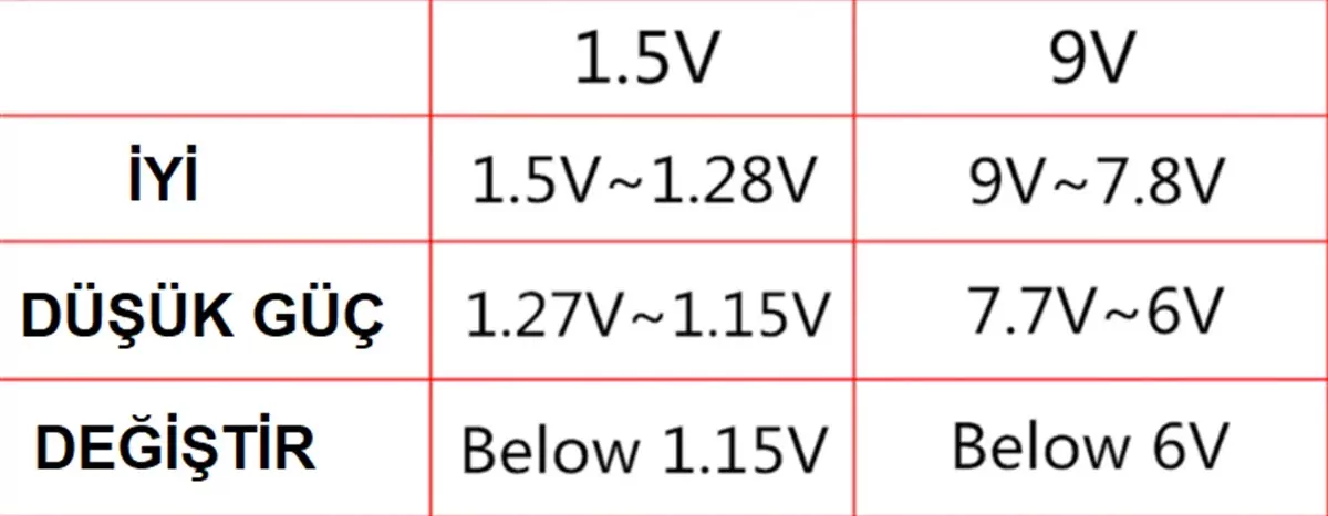 Tüm 1.5V, 3.7V, 9V ve 1.5V minyatür hücrelerin güç seviyesini kontrol edebilir.
