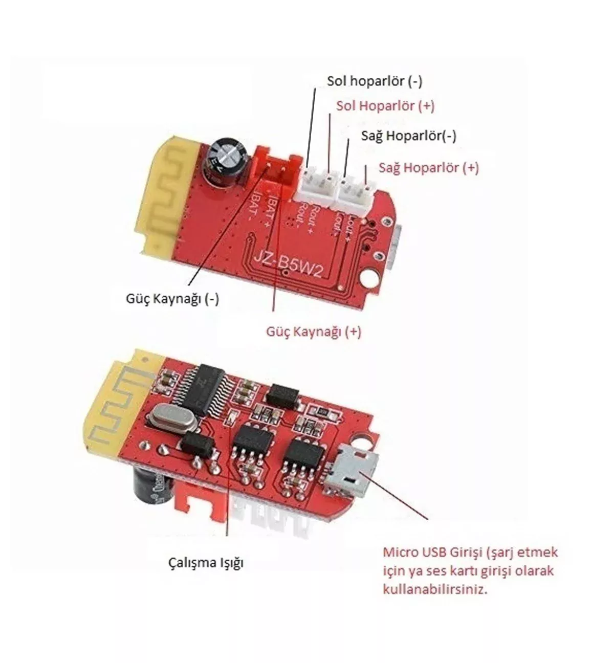 Ürünün sürümü 4.2'dir. Piyasadaki tüm bluetooth adaptörleri ve tüm telefonlar ile uyumludur. Çekim alanı, açık alanda 15 metredir. Eşleştirilen cihazları otomatik olarak bağlamayı ve otomatik olarak müzik çalmayı destekler. Her bir güç çıkışından 5W verebilen bu modül ile 5W+5W olacak şekilde ses sistemi oluşturabilirsiniz. Ses kalitesi 8002'dir. Herhangi bir sürücü yüklemeden bağlantıları yaptıktan sonra çalıştırabilirsiniz. Yüksek ses kalitesiyle, geliştirilmeye uygundur. Soundbox sistemi ile ürünü geliştirebilirsiniz.