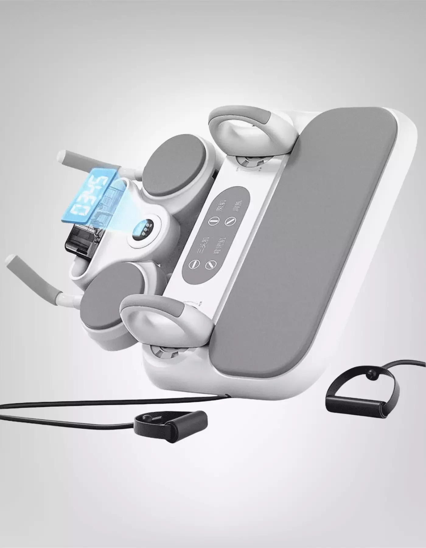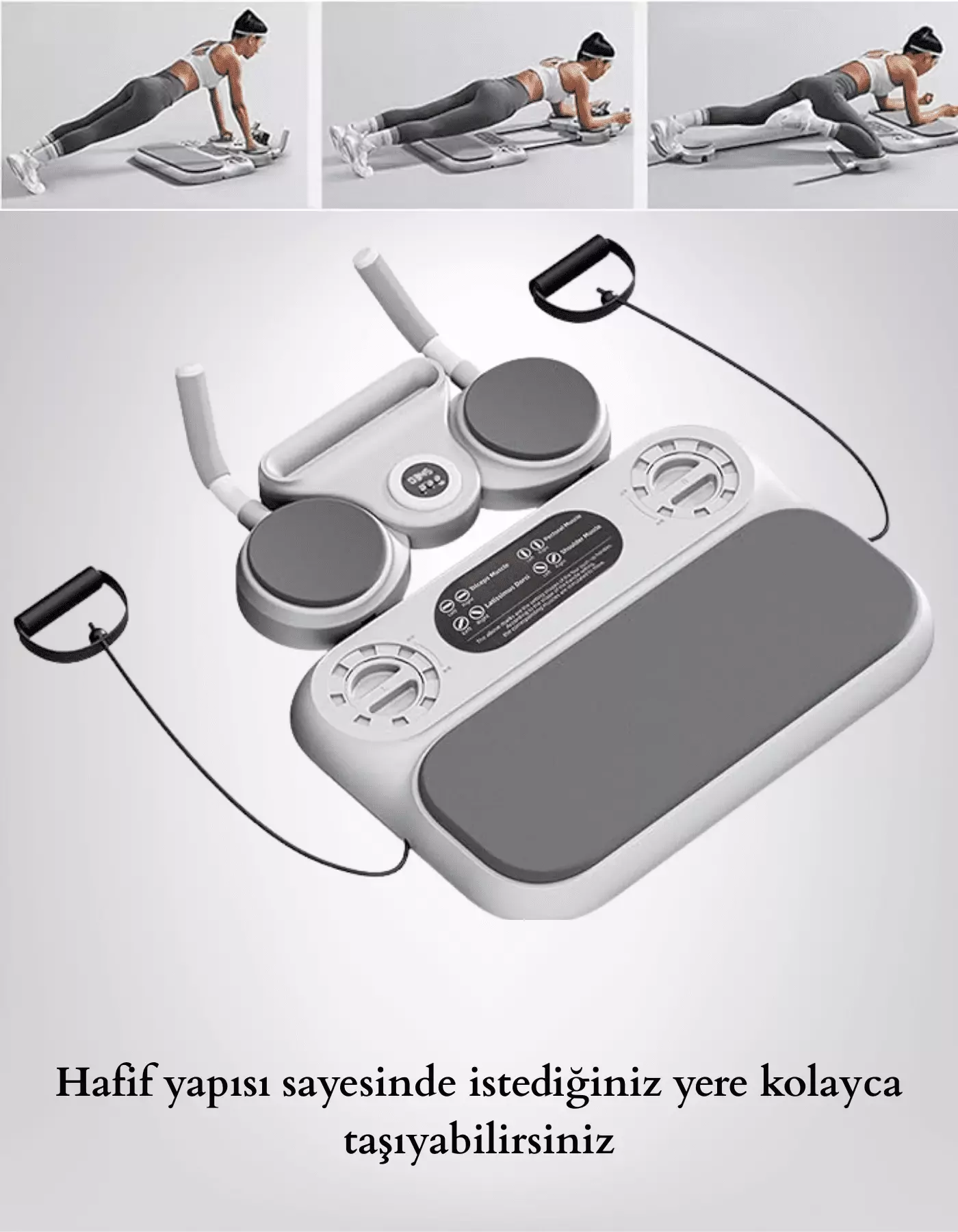 Şınav, plank, karın kası, direnç bandı egzersizleri — hepsi tek cihazda.; Cihaz sabit kalır, sadece kollar hareket eder