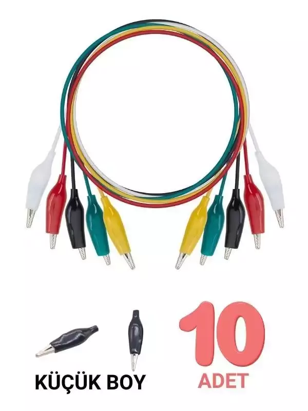 Test kablosu sarı, kırmızı, yeşil, beyaz ve siyah renklerden oluşur. Uzunluk 50 cm’dir. ; Timsah ağızlı kablo elektrik devrelerinde sinyal ve güç iletimini kolaylıkla sağlar. ; Kablo timsah ağızlı iki taraflı timsah ağızlı çift uçlu olup içerisinde 10 adet bulunur. ; Timsal krokodil aralarında iletim bulunmayan iki noktasında geçici bir süre iletim sağlar. ; Turn krokodil kablo timsah ucundaki iletkenlik seviyesi çok yüksektir. ;