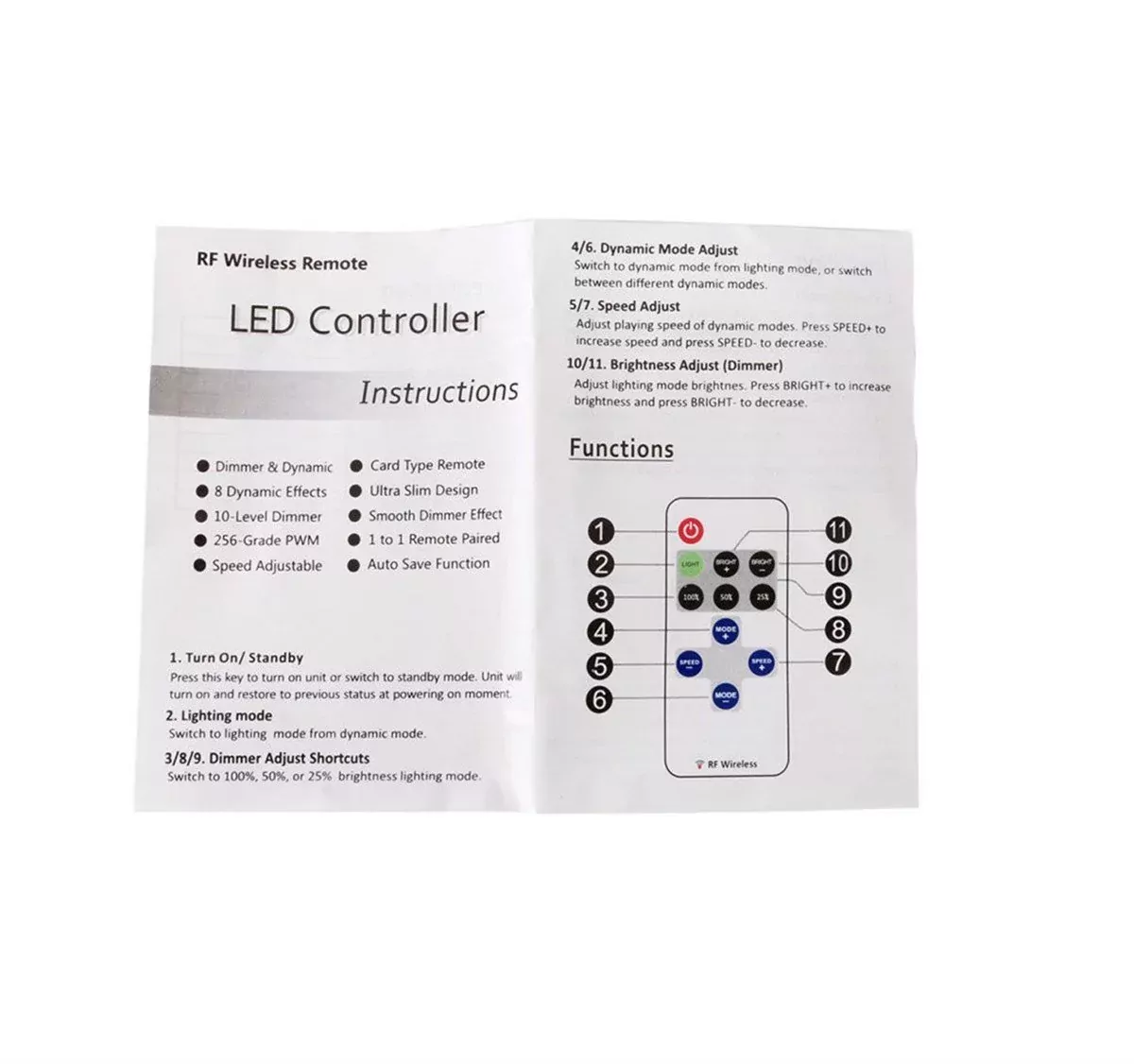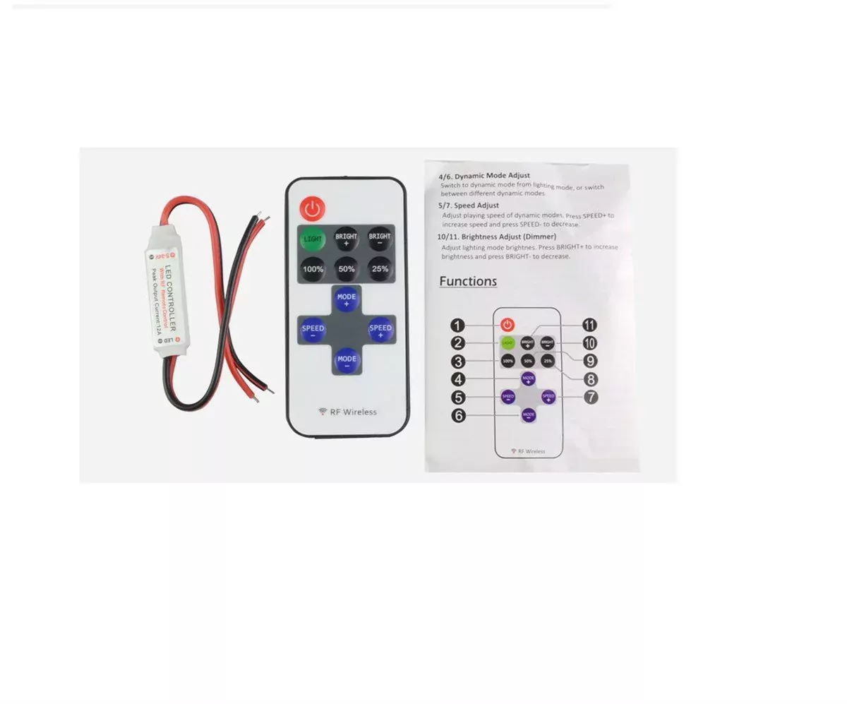 Özellikler : 8 Dinamik Etki 10 Seviyeli Dimmer 256 Kademeli PWM Ayarlanabilir Hız Uzaktan Kontrol Edilebilir Ultra İnce Tasarım Pürüzsüz Dimmer Etkisi 1'e 1 Uzaktan Eşleştirilme Otomatik Kaydetme Fonksiyonu Uzaktan Kumandanın Kurulumu 1. Güç kaynağı Bu birim DC 5 V ile 24 V güç kaynağını kabul eder. Kırmızı kablo pozitif ve siyah kabloya negatif bağlanmalıdır. Lütfen LED uygulamasına göre uygun güç kaynağını seçin. 2. LED çıkışı Kırmızı kablo, LED pozitif ve siyah kabloya negatif olarak bağlanmalıdır. Maksimum çıkış akımı 12A, ana ünite aşırı ısınma durumunda lütfen yükü azaltın. Dikkat : LED çıkışını kısa devre yapmayın, bu kalıcı hasara yol açabilir! Paket İçeriği: 1 x Uzaktan Kumanda 1 x 12/24V Şerit Led Dimmer 1 x Pil
