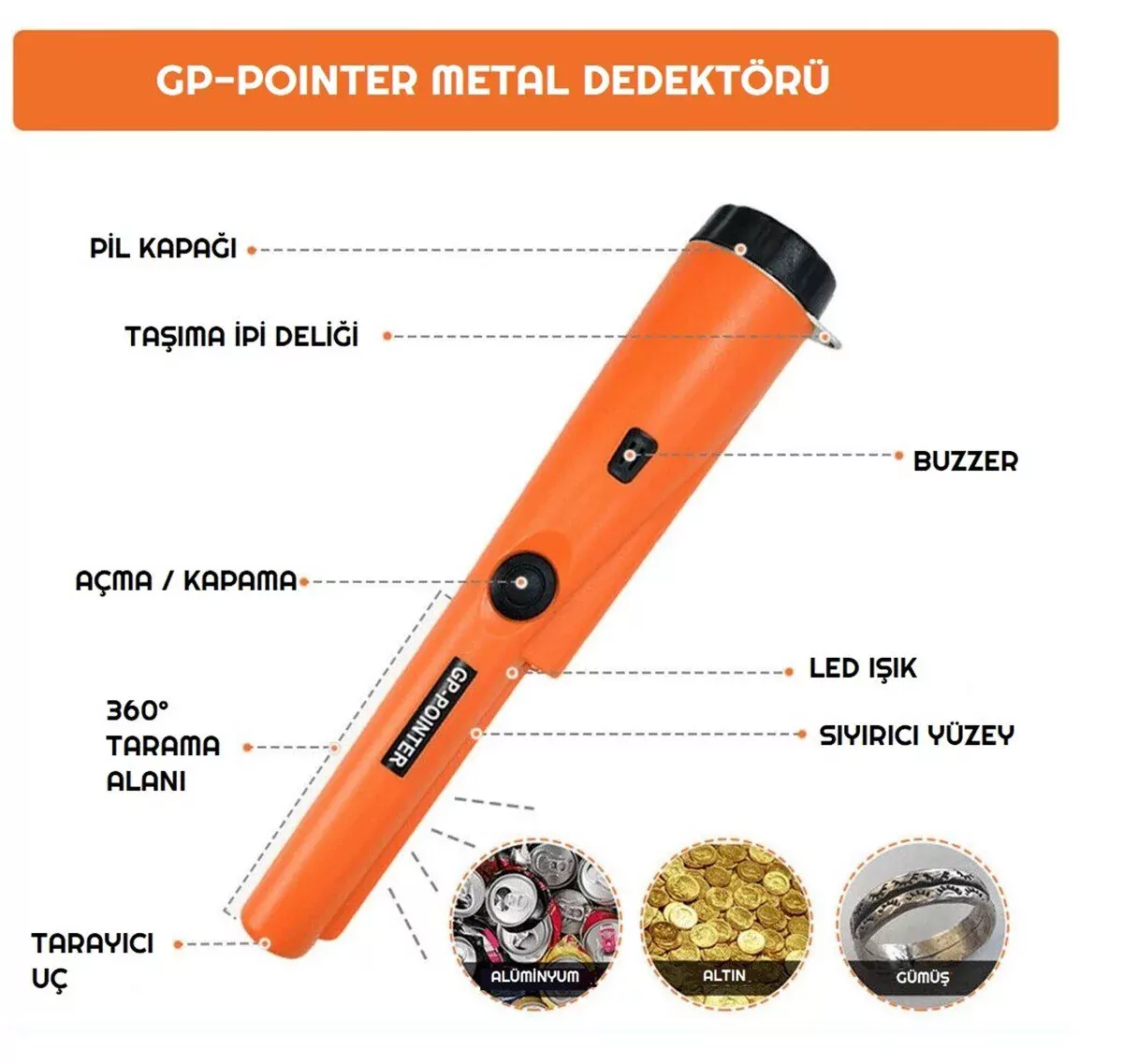 Su Geçirmez Kılıflı GP Pointer Altın Metal Dedektörü El Tipi Altın Gümüş