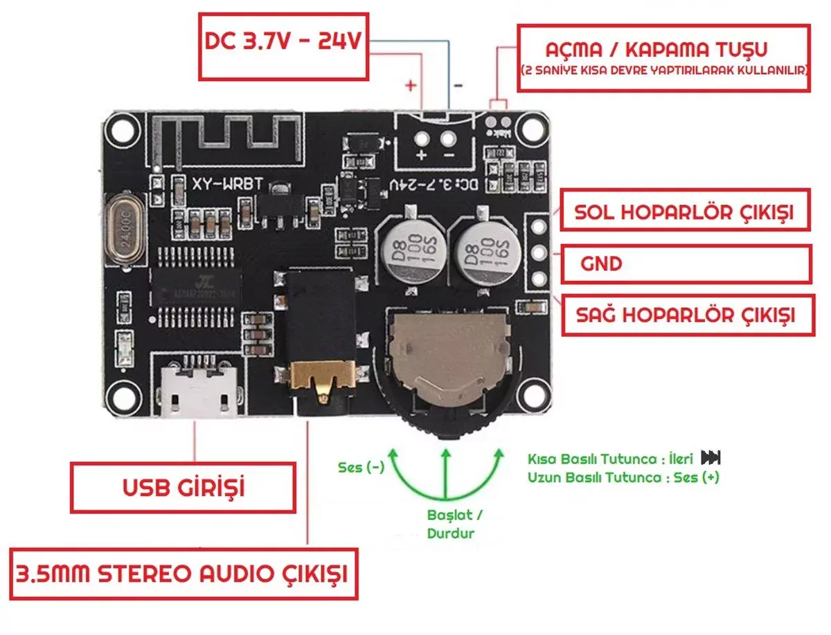 Elinizde bulunan hoparlörlerden bluetooth bağlantılı , cızırtısız ve kayıpsız bir sistem yapmak için idealdir. Üzerinde bulunan tuşlardan "başlatma-durdurma" , "ses açma/ kısma" ve "sonraki şarkıya geçme" özelliklerini kullanabilirsiniz. Ürünü 3.7-24V arası bir güç kaynağı ile çalıştırabilirsiniz fakat verimli kullanabilmeniz için 19V adaptör ile çalıştırmalısınız(düşük güçte oluştuğunuz sisteminizde oluşacak sorunlar bu nedenle olacaktır.)